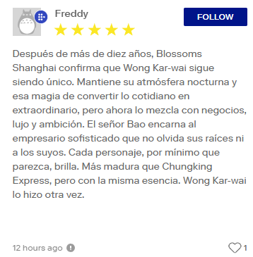 《繁花》上线MUBI后,法国观众Freedy留言:“在十多年的等待之后,《繁花》再次证明了王家卫依旧是那个王家卫。……每一个角色都鲜活立体,哪怕只是惊鸿一瞥,也能在观众心中留下独特的光芒。”
