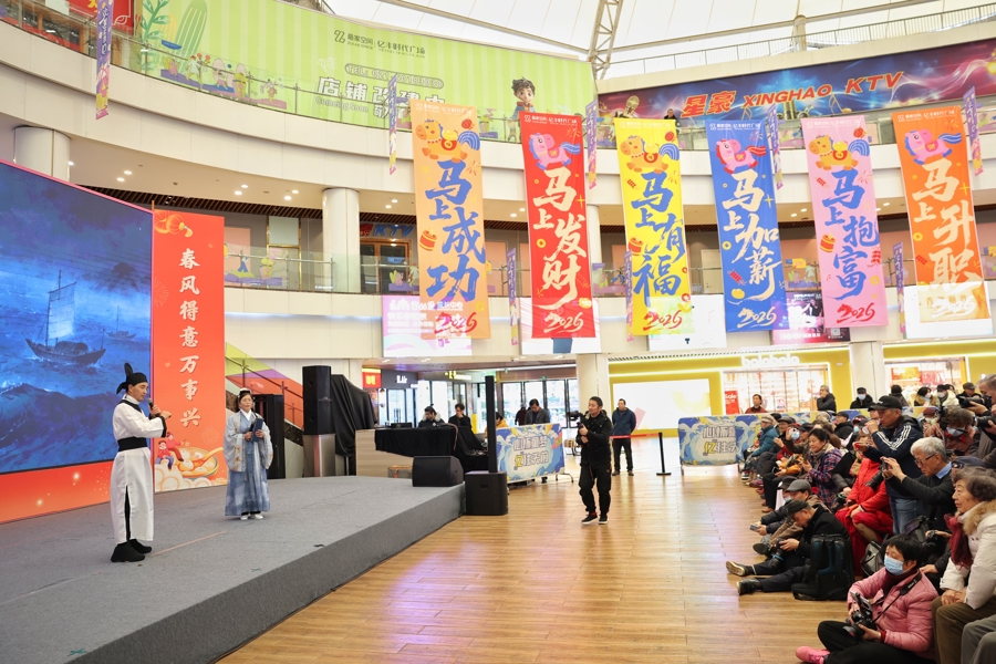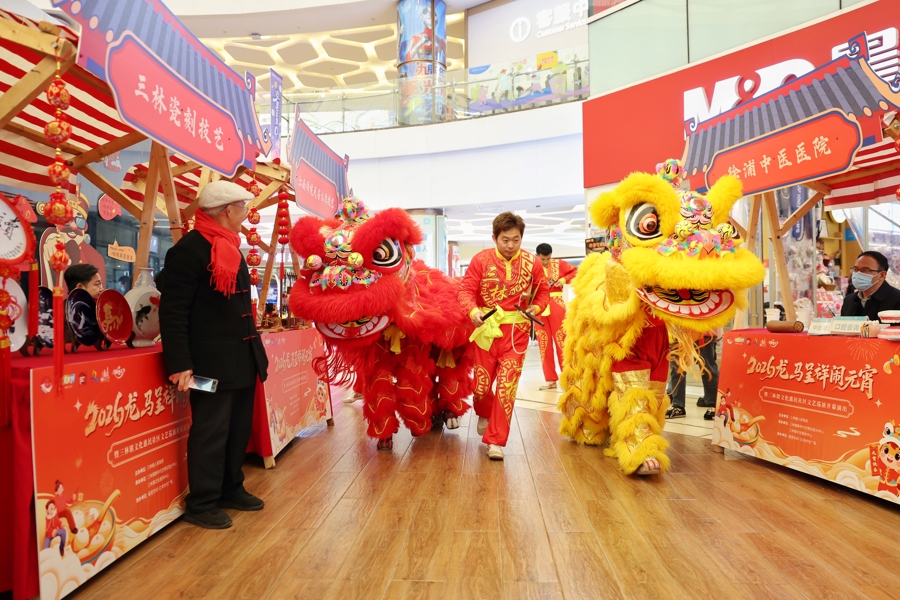 在亿丰时代广场,热闹的龙狮表演《龙马呈祥闹元宵》吸引了各个年龄层的观众。白发老人在舞台前的座位区坐下,年轻人和孩子们干脆站在一旁欣赏。舞台上,龙狮腾挪辗转,随着锣鼓渐缓,金龙盘旋成祥龙献瑞造型,狮嘴口衔条幅,“春风得意万事兴”“龙马呈祥千门喜”两行吉言缓缓展开。
