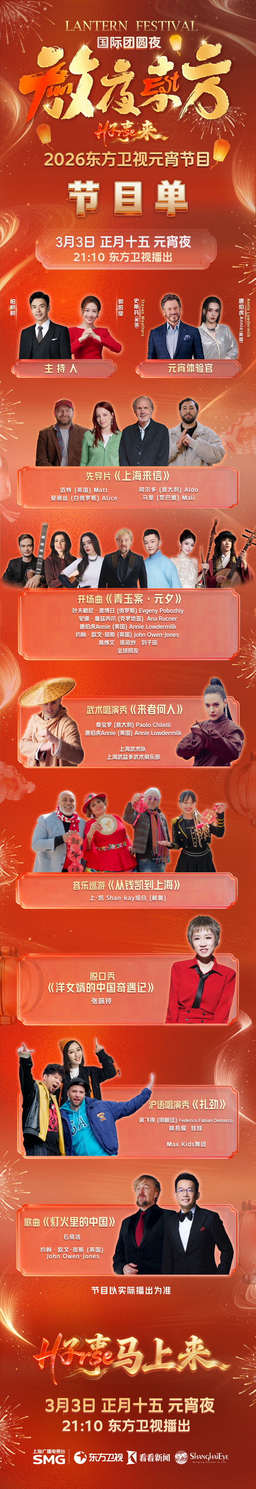 除了线下活动外,3月3日元宵夜黄金时段,东方卫视还将推出沉浸式跨文化体验秀《放夜东方·好事来》,包含中外合唱开场曲《青玉案·元夕》、武术唱演秀《来者何人》、音乐巡游《从钱凯到上海》、脱口秀《洋女婿的中国奇遇记》、沪语唱演秀《扎劲》、歌曲《灯火里的中国》等节目,与海内外观众共度马年元宵。